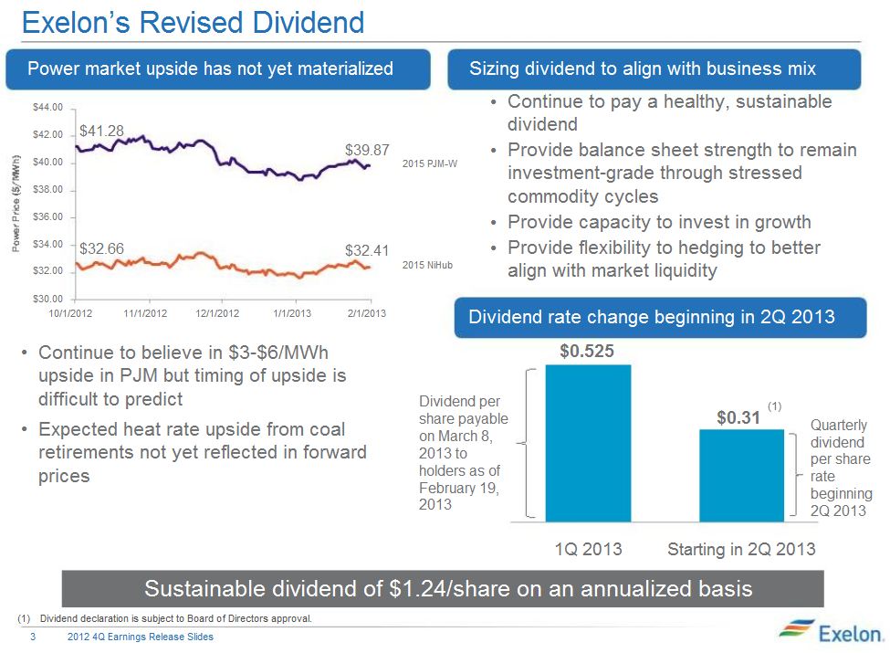 In its fourth-quarter earnings presentation slide deck, Exelon (EXC) announced that it would slash its quarterly dividend payout to $0.31 per share (was $0.525 per share) beginning in the second quarter of 2013 (see image below). Valuentum members were well aware of the risks of the dividend cut long before it became apparent to the market. Our July 2012 dividend report on Exelon revealed a 0.3 Dividend Cushion score, and our October 2012 dividend report revealed a -0.1 Dividend Cushion score. Any Dividend Cushion score below 1 indicates that there is significant risk with respect to the long-term sustainability of a company's dividend. Our article, Why Dividend Growth Investing Needs to Be Forward Looking, is a must read for income investors. We update our Dividend Reports on firms regularly, and we encourage members to check the Dividend Cushion scores on their income investments at least quarterly (in accordance with our update cycle). We expect to update our dividend report on Exelon soon, incorporating the company's new dividend projections shown below (Image Source: Exelon's 4Q Earnings Presentation). << FAQ: Where Can I Find the Valuentum Dividend Cushion Score? |