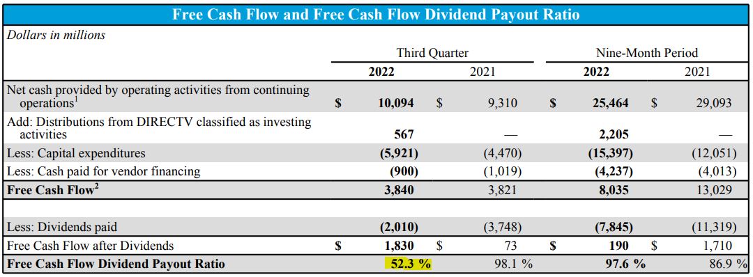 Image: AT&T’s dividend obligations have been substantially reduced, aiding in its coverage of the payout with free cash flow. Image Source: AT&T. By Brian Nelson, CFA AT&T Inc. (T) has taken investors on a wild ride the past couple years, first saying it would support its payout as recently as early 2021, and then cutting it as it pulled a 180 on its strategic vision. However, in the communication giant’s third-quarter report, released October 20, AT&T showed robust free cash flow generation ($3.84 billion) that nearly doubled cash dividends paid in the period ($2.01 billion). We liked this a lot as it reveals marked improvement in coverage on a year-over-year basis. However, the uncertain economic climate coupled with inflationary pressures on consumers, not to mention an increased competitive environment, leave us decidedly on the sidelines with respect to shares. The company showcased 708,000 postpaid phone net adds and 338,000 Fiber net adds in the period, and while both wireless and broadband revenues advanced during the quarter, the economic environment could be at the precipice of a huge pullback in consumer discretionary expenses – meaning this strength and optimism is likely short-lived. The huge problem with AT&T, not unlike that of other high dividend yielders out there, is its massive net debt position, which stood at $131.1 billion at the end of the quarter, implying a net-debt-to-adjusted EBITDA ratio of 3.22x. This isn’t extraordinarily high for a company of AT&T’s caliber, but it does signal a company that remains hugely overleveraged due to the capital-intensity of its operations. Thanks to $4-$6 billion in targeted run-rate cost synergies by the end of this year, however, AT&T noted that adjusted EPS from continuing operations for the full year is now targeted at $2.50+, a decent bump from its prior outlook. Concluding Thoughts AT&T’s free cash flow generation in the third-quarter 2022 was good enough to significantly cover the cash dividends paid in the period, generating a free cash flow dividend payout ratio of 52.3% versus 98.1% in the same period a year-ago. Though its massive net debt position will continue to weigh on its Dividend Cushion ratio, AT&T’s free cash flow coverage of the dividend is looking much better these days. Still, AT&T has a lot to prove, and CEO John Stankey has said as much. The WarnerMedia acquisition and spin-off has left a sour taste in many an AT&T investor’s mouth, and while we liked the improvement shown in AT&T’s third-quarter 2022 results, we’re not looking to add the shares to any of the newsletter portfolios at this time. Our fair value estimate stands at $16 per share, and its Dividend Cushion ratio is decidedly negative. Shares yield ~7.1%. Telecom Services: CMCSA, LUMN, DISH, T, TMUS, VZ, SBAC, AMT, CCI, PARA ----- The High Yield Dividend Newsletter and accompanying simulated portfolio is an add-on to your existing membership. Add this feature to your membership today! $1,000/year. No refunds offered. This is a recurring membership. Cancel anytime. --------------------------------------------- About Our Name But how, you will ask, does one decide what [stocks are] "attractive"? Most analysts feel they must choose between two approaches customarily thought to be in opposition: "value" and "growth,"...We view that as fuzzy thinking...Growth is always a component of value [and] the very term "value investing" is redundant. -- Warren Buffett, Berkshire Hathaway annual report, 1992 At Valuentum, we take Buffett's thoughts one step further. We think the best opportunities arise from an understanding of a variety of investing disciplines in order to identify the most attractive stocks at any given time. Valuentum therefore analyzes each stock across a wide spectrum of philosophies, from deep value through momentum investing. And a combination of the two approaches found on each side of the spectrum (value/momentum) in a name couldn't be more representative of what our analysts do here; hence, we're called Valuentum. |