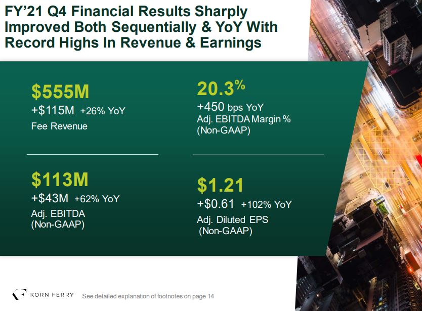 Image Shown: Korn Ferry posted record fee revenue and diluted EPS performance in the final quarter of fiscal 2021 as its business continued to recover. We include Korn Ferry as an idea in our Best Ideas Newsletter portfolio and continue to be huge fans of the name. Image Source: Korn Ferry – Fourth Quarter of Fiscal 2021 IR Earnings Presentation By Callum Turcan On June 22, the global organizational consulting firm Korn Ferry reported fourth quarter earnings for fiscal 2021 (period ended April 30, 2021) that beat both consensus top- and bottom-line estimates. Shares of KFY surged higher by almost 10% during the normal trading session on June 22 as management provided promising near-term guidance in conjunction with the earnings update. The ongoing economic recovery from the coronavirus (‘COVID-19’) pandemic in the US and elsewhere is having a powerful impact on Korn Ferry’s outlook, which is currently quite bright. From January 12, 2021, when Korn Ferry was first added to the Best Ideas Newsletter portfolio (link here), to the end of the normal trading session on June 22, share of KFY are up ~49% while the S&P 500 (SPY) is up ~11% during this period (before taking dividend considerations into account). We are huge fans of Korn Ferry and continue to view the firm’s capital appreciation upside quite favorably. The top end of our fair value estimate range sits at $79 per share of Korn Ferry. In conjunction with its latest earnings update, Korn Ferry boosted its dividend by 20% sequentially, bringing its quarterly payout up to $0.12 per share or $0.48 on an annualized basis. Shares of KFY yield ~0.7% on a forward-looking basis as of this writing. Please note that when Korn Ferry publishes its Fiscal 2021 Annual Report (10-K SEC filing) and after we roll our valuation model forward, we may adjust our fair value estimate higher. Earnings Update During the fiscal fourth quarter, Korn Ferry’s GAAP revenues jumped 24% year-over-year as its fee revenue recovered from the pandemic-induced fall. The company’s strength in North America was key, and its international business is also starting to regain some steam according to management commentary provided during the firm’s latest earnings call. Management noted that Korn Ferry’s strength was widespread with every business line reporting growth. Fee revenue, which represents the lion’s share of Korn Ferry’s sales, hit at a record at $555 million last fiscal quarter (up 26% year-over-year and up 17% sequentially). Korn Ferry reported $1.21 in GAAP diluted EPS in the fiscal fourth quarter, another all-time high.