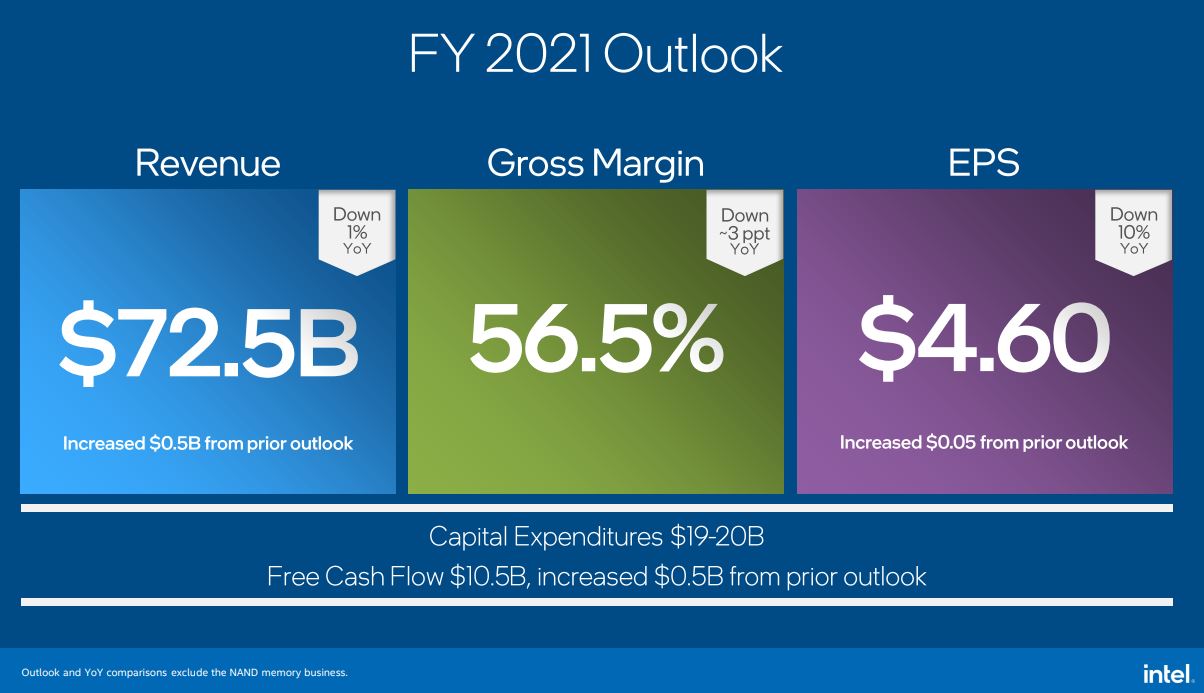 Image Shown: Intel's shares have outpaced the S&P 500 SPDR (SPY) since we removed them October 2020. By Brian Nelson, CFA We removed Intel (INTC) from the simulated newsletter portfolios in late October 2020. Since then, the chip giant has outpaced the index modestly. We’re not reading too much into this, but we wanted to keep the name in front of you as it has been an idea in the simulated newsletter portfolios in the past. Shares yield about ~2.4% at the time of this writing. On April 22, Intel reported first-quarter 2021 results that showed flat non-GAAP revenue performance, while non-GAAP earnings per share declined modestly. Intel has lost a bit of its edge against Advanced Micro Devices (AMD) in recent years, and the market has been all over this. AMD’s stock has advanced nearly 50% during the past year, while Intel’s shares have been about flat over the same time period. Part of the reason why we had been huge fans of Intel in the past had to do with its Data Center Group (DCG), but the segment posted revenue of $5.6 billion during the first quarter of 2021, down 20% on a year-over-year basis. As the world moves to the “cloud,” we would expect this area to be more of a secular grower, so the lackluster performance raises some major red flags. Though management expects a return to growth soon, Nvidia’s (NVDA) first data center CPU could make a sustainable bounce back more challenging for Intel. Image Shown: Intel’s outlook for 2021. Image Source: Q1 2021 Earnings Presentation That said, Intel raised its full-year 2021 guidance and now expects non-GAAP revenue of $72.5 billion (up $500 million from prior guidance) and non-GAAP EPS of $4.60 (up $0.05 from prior guidance). Free cash flow is now expected to come in at $10.5 billion on the year, up $500 million from prior guidance. We continue to remain cautious on shares, though management painted an optimistic tone with respect to its outlook on the conference call: We continue to see very strong PC demand with both TAM and our internal PC supply growing double-digits year-over-year, but we expect CCG (Client Computing Group) revenue to be more first-half-weighted than normal seasonality due to industry-wide supply constraints and the continuing ramp-down of modem and Apple Mac revenue. In data center, we expect increased demand in the second half as both cloud, enterprise and government segments return to growth. Gross margin percent will be lower in the second half of the year, predominantly due to increased 7-nanometer start-up costs and industry-wide supply constraints impacting client volume and mix. We expect increased R&D throughout the year as we invest in our roadmap and IDM 2.0 strategy (1). Intel expects to continue to generate considerable free cash flow in 2021, well in excess of our expectations for its annual run-rate dividend payments of ~$5.5-$6 billion, and we fully expect it to make good on its payout. However, Intel’s move to invest in foundries to compete more aggressively with TSMC (TSM) and Samsung (SSNNF, SSNLF) coupled with increased competition from AMD and Nvidia means the company is walking on some thin ice from a competitive standpoint. With multiple balls in the year, Intel may come up short on its ambitions. Valuentum’s Callum Turcan had the following to add: “AMD has really been eating into Intel's server chip market share of late and now Nvidia is also looking to get into that arena; it is not a pretty picture for Intel given its manufacturing problems.” Though Intel’s shares have held up since we removed them from the newsletter portfolios, we’re expecting some bad news on the horizon. The company’s large net debt position is yet another reason to be leary of the stock, even though free cash flow generation remains robust. Concluding Thoughts Intel has had a terrific run, but we think bad news may be on the horizon. The chip giant is juggling too many balls at the moment, and competition from the likes of AMD and Nvidia could result in some tough sledding in coming years. We don’t see much risk to the dividend payout, but the lower end of our fair value range may be a reasonable target for shares. We feel that a big miss is coming that may take the market by surprise later this year or in 2022. Execution will be key, and Intel has its work cut out for it. We expect to make some tweaks to our valuation model given the report, but we don’t expect a material fair value estimate change at this time. The company’s Dividend Cushion ratio stands at 1.4. (1) From the 10-Q: “On March 23, 2021, our CEO Pat Gelsinger announced our "IDM 2.0" strategy, the next evolution of our IDM model. IDM 2.0 combines three factors. First, we will continue to build the majority of our products in Intel fabs. Second, we expect our use of third-party foundry capacity to grow and to include manufacturing for a range of modular tiles on advanced process technologies. Third, we announced our plans to build a world-class foundry business with Intel Foundry Services, which will combine leading-edge process and packaging technology, committed capacity in the U.S. and Europe, and a world-class IP portfolio for customers, including x86 cores. To accelerate our IDM 2.0 strategy, we announced plans to invest $20.0 billion to build two new fabs in Arizona.” Downloads Intel's 16-page Stock report (pdf) Tickerized for INTC, AMD, NVDA, TSM, SSNLF, SSNNF Related ETFs: SOXX, SMH, SOXL, XSD, PSI ----- Valuentum members have access to our 16-page stock reports, Valuentum Buying Index ratings, Dividend Cushion ratios, fair value estimates and ranges, dividend reports and more. Not a member? Subscribe today. The first 14 days are free. Brian Nelson owns shares in SPY, SCHG, QQQ, DIA, VOT, and IWM. Brian Nelson's household owns shares in HON, DIS, HAS. Some of the other securities written about in this article may be included in Valuentum's simulated newsletter portfolios. Contact Valuentum for more information 