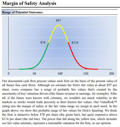 Image Shown: Dick's Sporting Goods' stock price soared following the release of its first-quarter fiscal 2021 earnings report and robust guidance for the remainder of the year. We added the sporting goods retailer to the Dividend Growth Newsletter portfolio last November, and we continue to like shares. By Brian Nelson, CFA On Wednesday, May 26, Dick’s Sporting Goods (DKS) released a stellar fiscal first-quarter earnings report for the period ending May 1, 2021, that showed its omni-channel sales strategy is paying off as the U.S. economy continues its robust recovery. We added Dick’s Sporting Goods to the Dividend Growth Newsletter portfolio in November of last year, and its dividend growth prospects remain as strong as ever. In March of this year, the company raised its dividend payout 16%, to $1.45 on an annualized basis (~1.5% dividend yield), and shares have rocketed to our fair value estimate of $97 per share, as of this writing. We like to think of valuation as a range of fair value outcomes, and in light of Dick’s Sporting Goods’ strong outlook for fiscal 2021, the high end of the fair value estimate range of $116 per share may be within reach. Image Shown: We value shares of Dick's Sporting Goods at $116 at the high end of our fair value estimate range. We use a discounted cash-flow model to value shares of non-financial companies in our coverage universe and employ a fair value estimate range to capture the uncertainty of future fundamental forecasts that drive the point fair value estimate. During the first quarter of fiscal 2021, Dick’s Sporting Goods’ net sales advanced 119% from last year’s quarter and were up 52% from the pre-COVID-19 first quarter of fiscal 2019. E-commerce strength was prevalent, as penetration advanced to 20% of sales in the first quarter of fiscal 2021 from 13% of sales in the same period a couple years ago. The company continues to deliver for athletes, meeting their shopping preferences whether they want to order online or in the store. Here’s what the executive suite had to say about the quarterly performance in the press release: We are in a great lane right now, and 2021 will be our boldest and most transformational year in the Company's history. We believe the future of retail is experiential, powered by technology and a world-class omni-channel operating model. Importantly, we are reimagining the athlete experience, both across our core business and through new concepts that we have been working on for the past several years, which will collectively propel our growth in the future. We are very pleased to deliver another exceptionally strong quarter, achieving record first quarter sales and our highest-ever quarterly earnings, both significantly exceeding our expectations. The strength of our diverse category portfolio, supply chain, technology capabilities and omni-channel execution helped us continue to capitalize on strong consumer demand across golf, outdoor activities, home fitness and active lifestyle. We also saw a resurgence in our team sports business as kids began to get back out on the field after a year in which many youth sports activities were delayed or cancelled. Looking ahead, we remain very enthusiastic about our business and are pleased to increase our full year sales and earnings outlook. During the current fiscal 2021, Dick’s Sporting Goods expects consolidated same-store sales to advance 8%-11% and GAAP profit margins on income before taxes to increase to the range of 9.4%-10.0%, more than a 3 percentage-point increase from levels in fiscal 2020 and roughly a 5 percentage-point increase from levels in fiscal 2019 at the midpoint of the range. Dick’s Sporting Goods’ e-commerce strategy is helping with margins, and its merchandise strategy is working with pricing mix. Total inventory fell 4% at the end of the first quarter on a year-over-year basis. Concluding Thoughts Dick’s Sporting Goods surprised the market to the upside in a big way when it reported first quarter earnings for fiscal 2021 on May 26. Management is targeting non-GAAP earnings per share for fiscal 2021 in the range of $8.00-$8.70, implying shares of the sporting goods retailer are trading at just 11.3 times the high end of this year’s earnings guidance. A solid balance sheet and strong free cash flow generation support the company’s dividend growth profile. We continue to like how Dick’s Sporting Goods is positioned for the long haul, and it remains an idea in the Dividend Growth Newsletter portfolio. Downloads Dick's Sporting Goods' Stock Report (pdf) >>